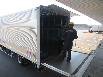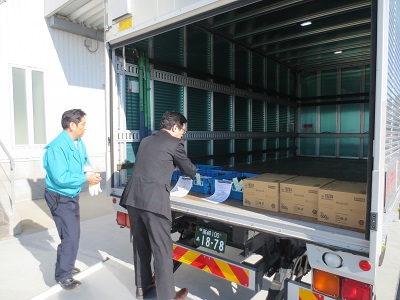 ローソン群馬CDCで救援物資をトラックに積み込み。